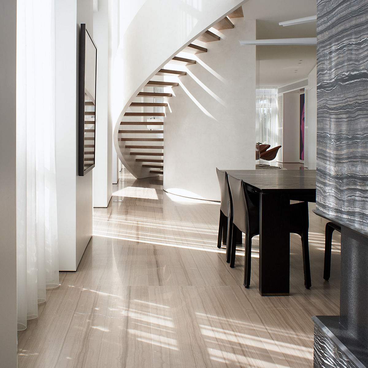 The interiors feature a soft, neutral colour palette accented by sculptural elements and natural material finishes, including a leather-finished, two-way Costa Azure marble fireplace in the main-level dining room and sculptural spiral staircase separating the living and dining areas.
