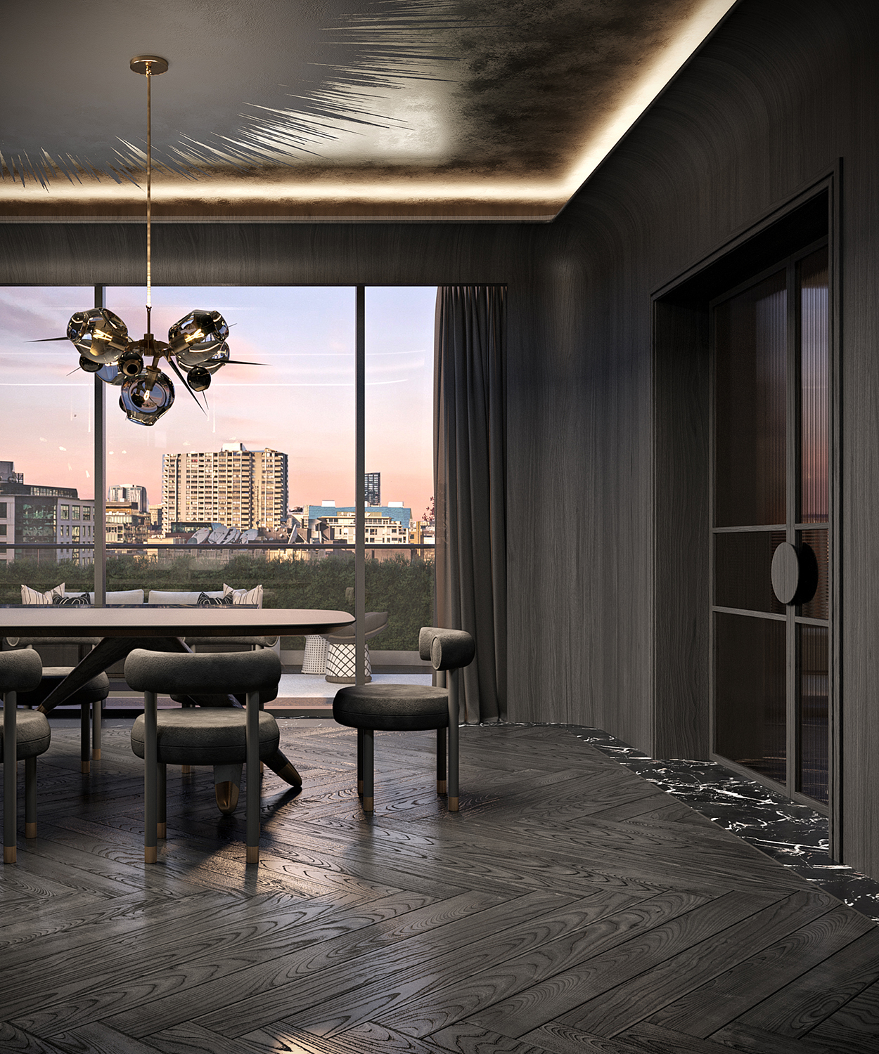 With its fashionable residences accessed through the 6th-floor luxurious sky lobby, discover a world where black and white complete each other like a leather jacket over a little black dress. Strutting through reeded glass doors over dark herringbone hardwood floors framed with marble borders, guests will gush over the lavish space curated with culture and mystery. Bespoke artwork by Peter Tunney adorns the foyer with graphic artistry, while a tall abstract sculpture by Kelly Wearstler leads the eye to the distant lush terrace. Contemporary crown mouldings and ribbed tambour panelling details are softly lit by the soothing cove lighting, bringing warmth and sophistication to the timeless interiors.