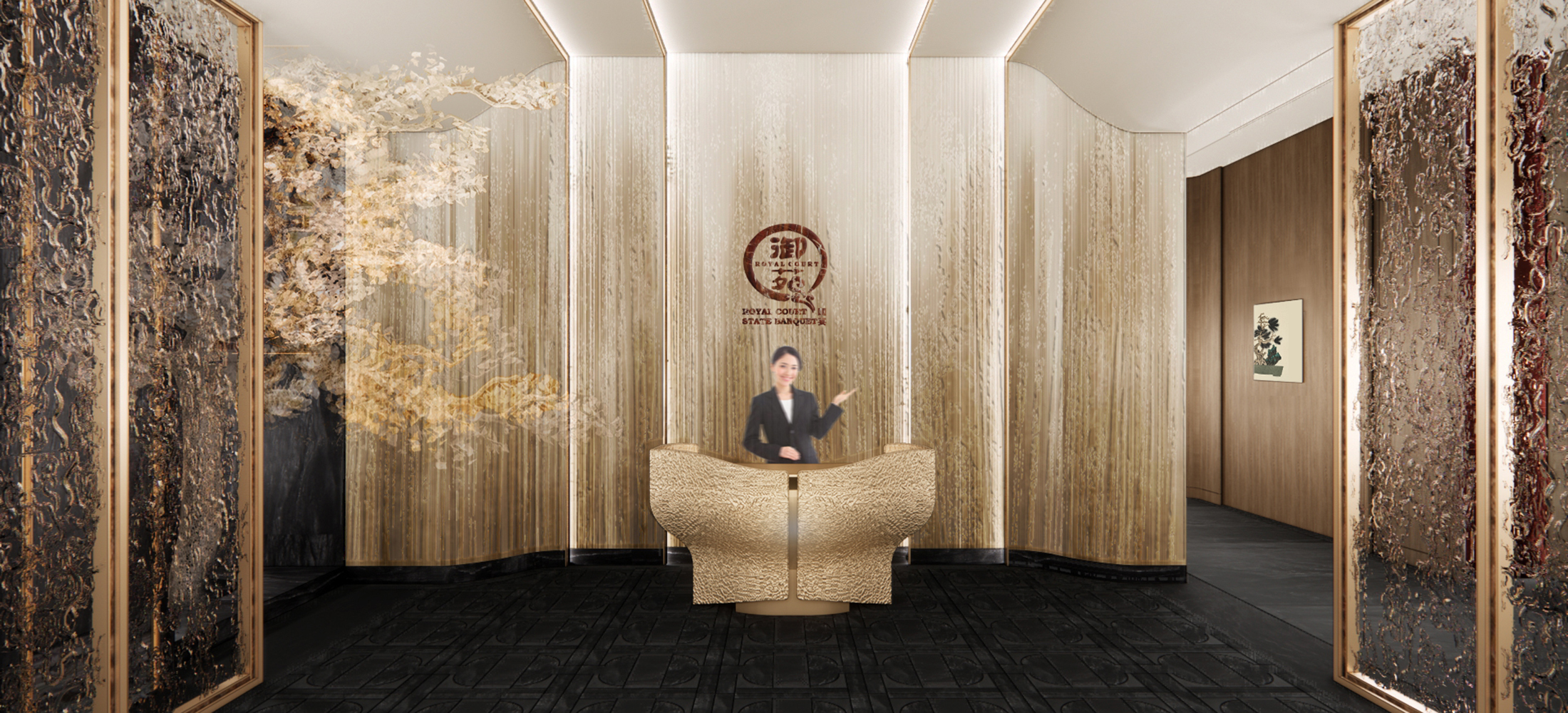 Exploring the bronze and granite grand staircase from the Diaoyutai Qingdao hotel's sky lobby to the 38th floor, the guests will discover the traditional Chinese restaurant Royal Garden inspired by the utopian Penglai. Elegantly capturing the beauty of royal gardens and the mystical city, the Studio Munge-designed venue is an outstanding dining experience featuring an intimate "à la carte" section, a collection of curated private dining rooms and an exquisite VIP room for the most elite guests.