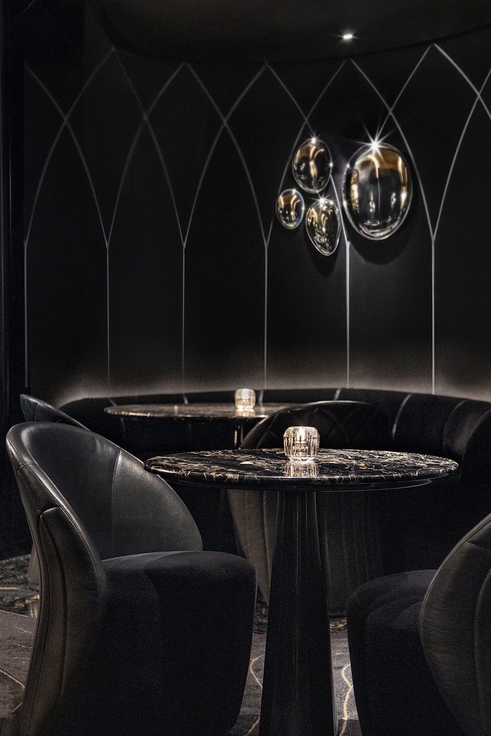 Leading guests to the lounge, a portal features bronze metallic walls and introduces the Portoro Gold stone present throughout the venue - an audacious black marble adorned with exquisite gold veining. The lounge's architecture is a visual delight, defined by sweeping gestures, and symmetrical waves. The ceiling, finished with a hand-painted gradient, seamlessly transitions from black to bronze as it smoothly evolves from 8 to 12 feet. Integrated soft cove lighting, precise pin spotlights, and additional Welles sconces create a sultry, velvety ambience.