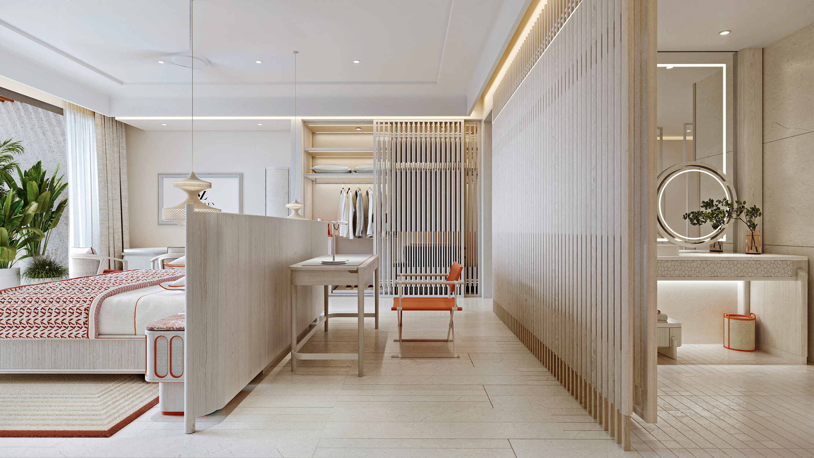 A retreat from social activities and a sanctuary of privacy, the luxurious suites boast playful patterns and woven textures, creating a warm and welcoming atmosphere. Depending on the room color scheme, the predominantly cream-white palette is accented with coral orange or oceanic blue. Scalloped carved wood, hand-tufted rugs, and piping details add a refined touch, while a curated leather-paneled bespoke minibar and humidor elevate the guest experience with thoughtful hospitality.